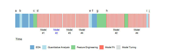 The initial activity starts with exploratory data analysis (EDA) to investigate the data (a). This involves evaluating simple summary measures and identifying predictors with strong correlations to the outcome. The process iterates between visualization and analysis until the modeler has a thorough understanding of the data.