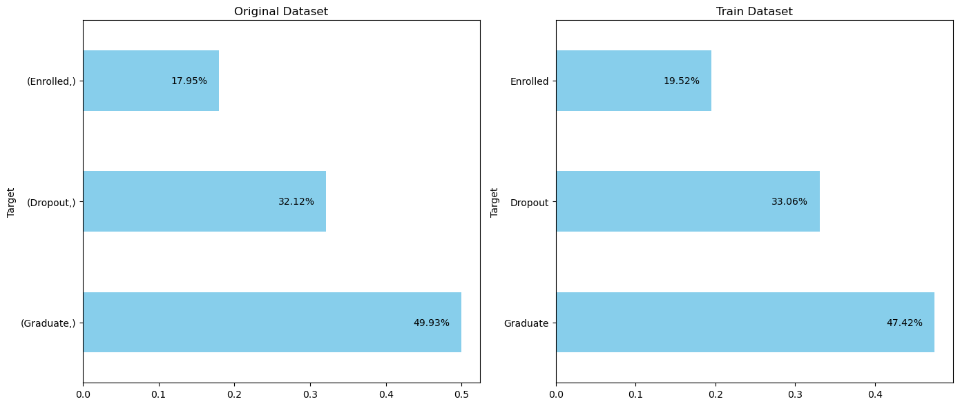 df.Target.value_counts(normalize=True).plot(kind='barh', ax=ax[1])We can use the set_title method from matplotlib to add a title to each plot