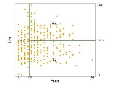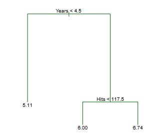 The figure represent a regression tree applied to the Hitters dataset. The response variable is Salary and the predictor variables are Years and Hits.